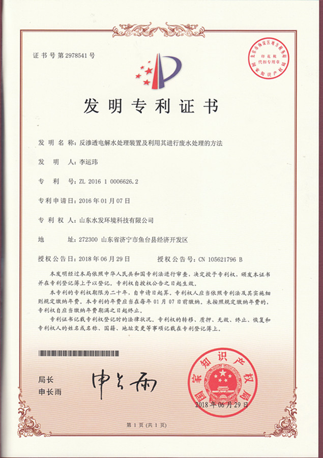 近日,山東水發環境科技有限公司自主研發的《反滲透電解水處理裝置及利用其處理廢水的方法》成功獲國家知識產權局授權并頒發發明專利證書。