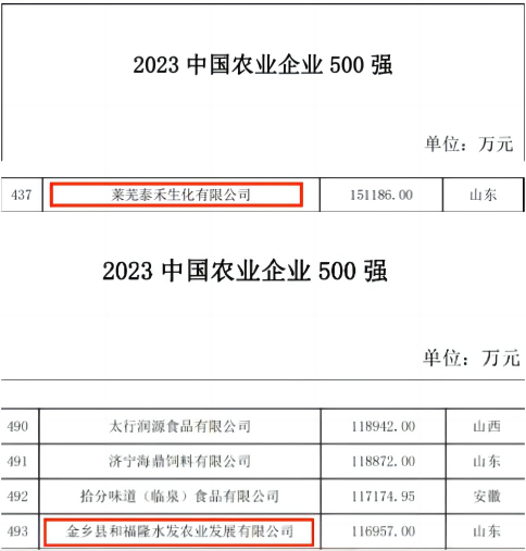 12月20日,“2023年中國農業(yè)企業(yè)500強”榜單正式發(fā)布,水發(fā)農業(yè)集團2家權屬公司首次上榜。萊蕪泰禾生化有限公司位列第437位,金鄉(xiāng)縣和福隆水發(fā)農業(yè)發(fā)展有限公司位列第493位。